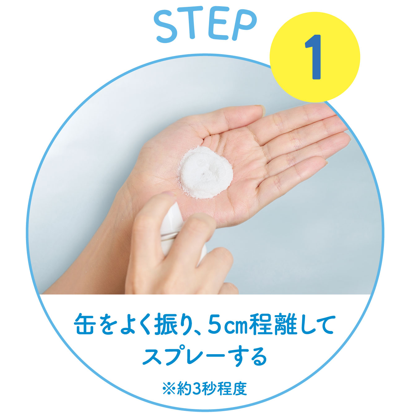 STEP1 ①缶をよく振り、手のひらに円を描くようにスプレーします。※約3秒程度 |
